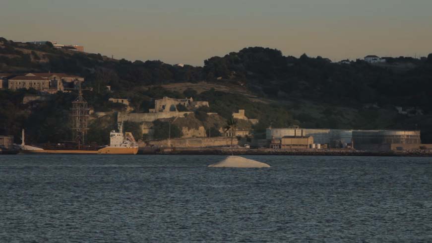 The film documents the silent journey of a floating island, inhabited by a tropical palm tree (Howea Forsteriana), relatively difficult to find in the northern hemisphere, which towers eleven meters over the island's surface. Built with no other purpose but Onofre's film, the island traverses the city of Lisbon along the Tagus River, from east to west, until it becomes lost over the horizon.